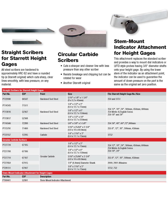 29 Scratch Gage, 70 Series Pocket Scribers, 67 Series Improved Scriber, 68 Series Adjustable Sleeve Scriber